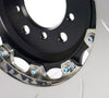The rotor and hat mount together through a floating mount system which utilizes 8-10 high strength alloy steel drive pins manufactured by GiroDisc in the USA to our own specifications and are cadmium plated for corrosion resistance.  The alloy drive pins transfer the load from the brake action while maintaining the axial and radial float between the disc rotor and hat.  The pins are secured by grade12 cap screws with hardened washers and mounted with anti-noise spring washers to allow for heat expansion while eliminating the rattle and noise associated with floating rotors.