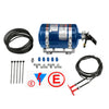 The complete kit includes the FIA-approved 2.25kg aluminum cylinder, 6m of 8mm tubing, bracket and straps, two straight inlet nozzles, three double Z nozzles, connectors, bulkhead fitting, tube clips, a decal pack, and both 2m and 4m pull cables for installation.