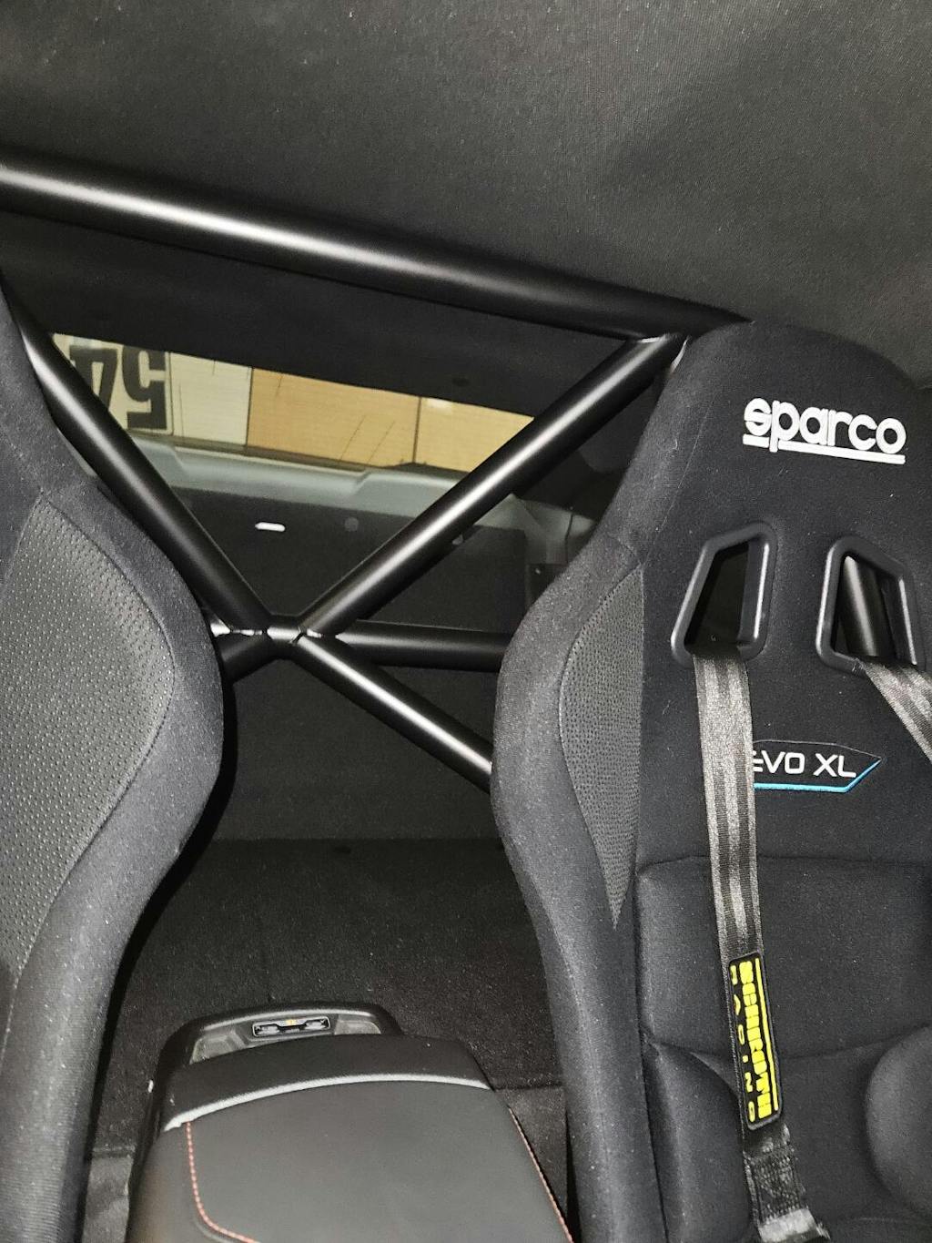 None of your interior trim panels need to be eliminated or cut. Your rear seat back can be re-installed, or you can opt for our custom-made Shrader rear seat delete, the perfect place to put a track bag, helmet and HANS, driver cooling system, etc. (you can hide stuff under there, too). If you ever want to put your car back to stock, it will go back together as though the roll bar was never there.
